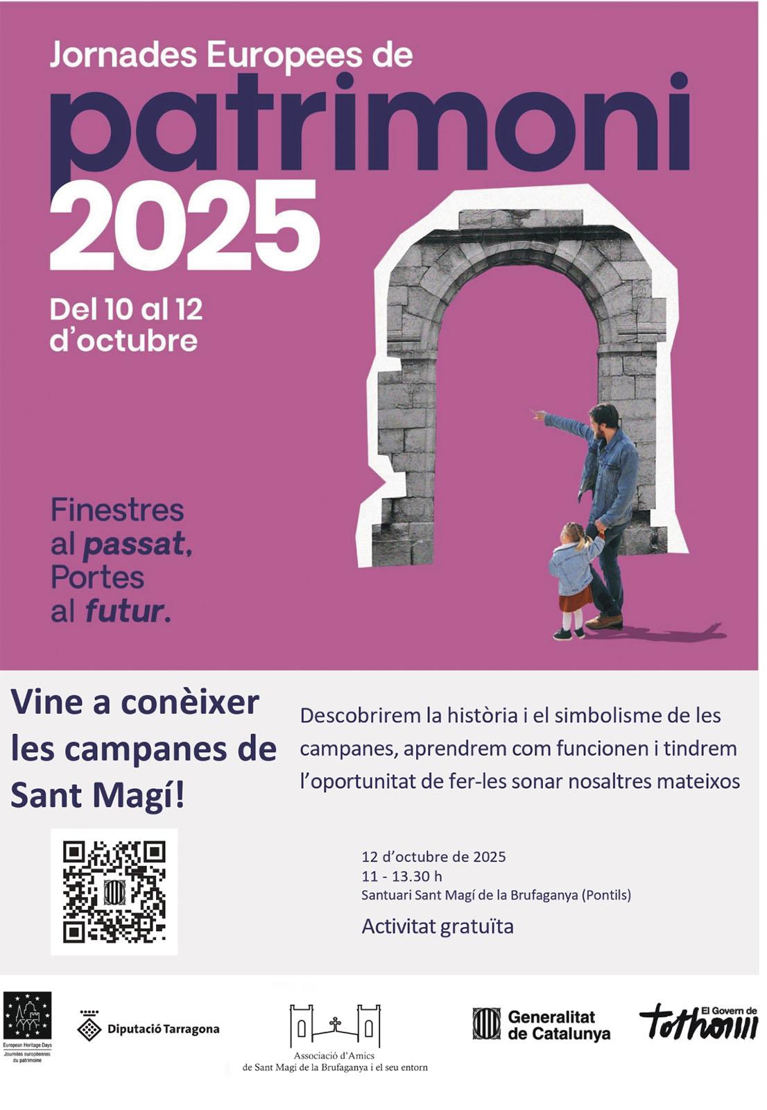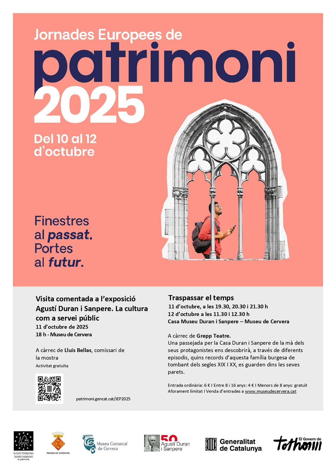 Els dies 10, 11 i 12 d’octubre de 2025 se celebra una nova edició de les Jornades Europees del Patrimoni (JEP). “Finestres al passat, portes al futur” és el tema escollit per aquesta edició, celebra la gran diversitat d'edificis que ens envolten i posa el focus en edificis i infraestructures de tots els estils i dimensions.