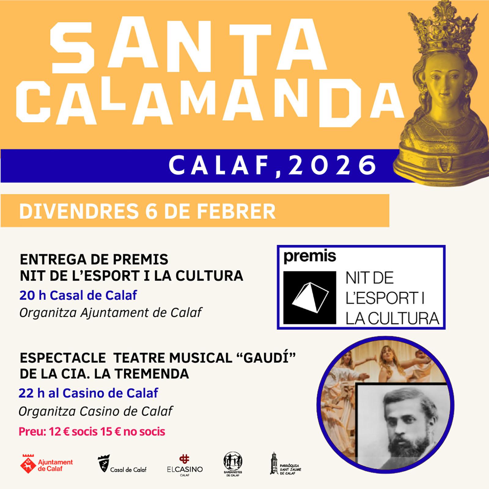 Divendres 6 de febrer, a les 20 h, el Casal de Calaf serà l’escenari d'una nova edició de la Nit de l’Esport i la Cultura, l'acte institucional en què s’atorgaran una dotzena de premis a entitats i persones que han destacat durant l’any 2025 en l’àmbit de l’esport i la cultura al municipi. La jornada continuarà a les 22 h al Casino de Calaf amb l’espectacle musical “Gaudí” de la companyia La Tremenda. Les entrades tenen un preu de 12 € per a socis i 15 € per a no socis. Venda d'entrades