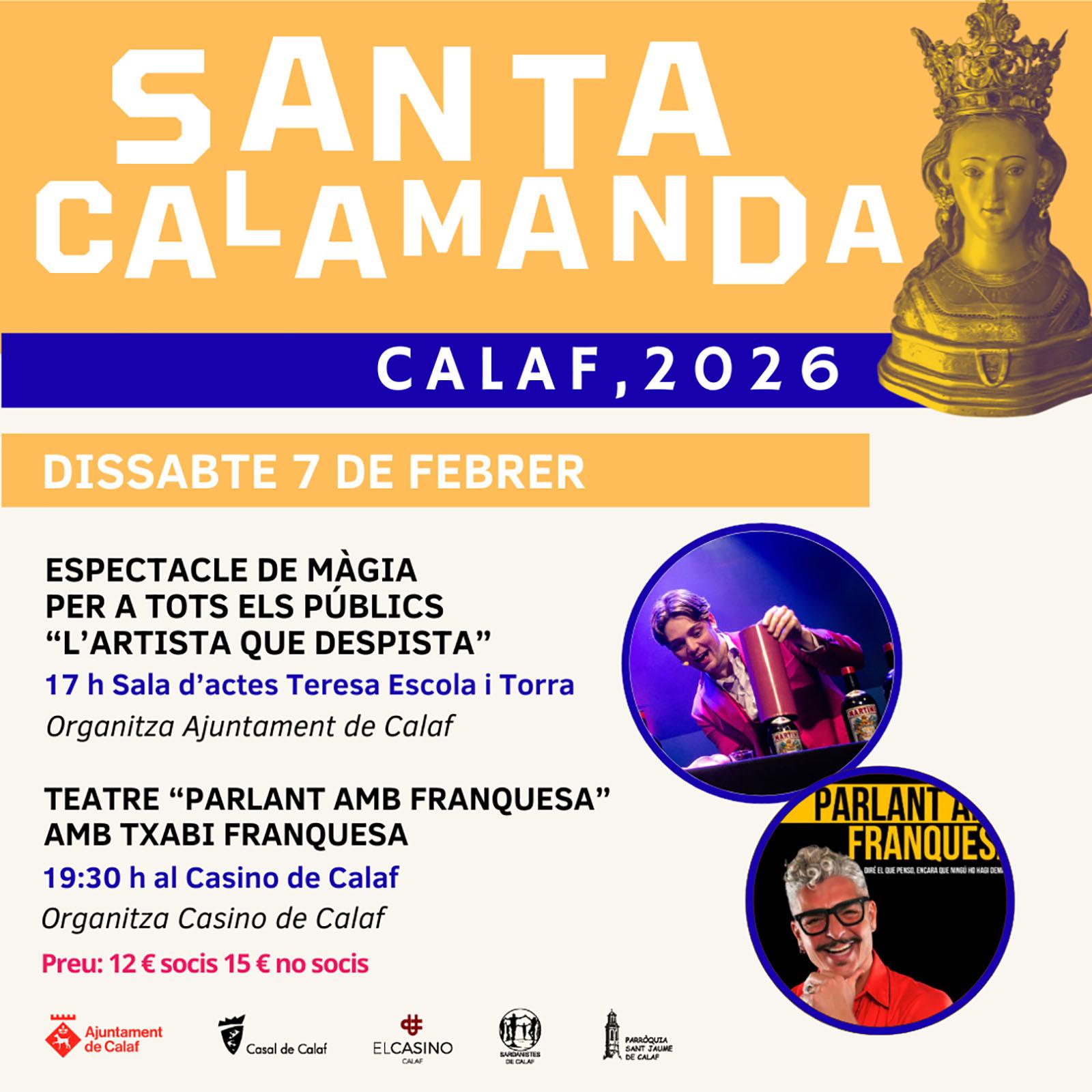 La festa s’iniciarà dijous 5 de febrer - festiu local - amb els actes més tradicionals. A les 11.30 h, tindrà lloc la missa en honor a Santa Calamanda i la ballada de la Metredansa a l’església de Sant Jaume. A continuació, a les 12.30 h, el Casino de Calaf acollirà sardanes amb la Cobla Nova Vallès. La jornada clourà a les 18.30 h amb ball amb Joan Vilandeny, també al Casino de Calaf. Preu 8 € per a persones sòcies i 10 € entrada general.