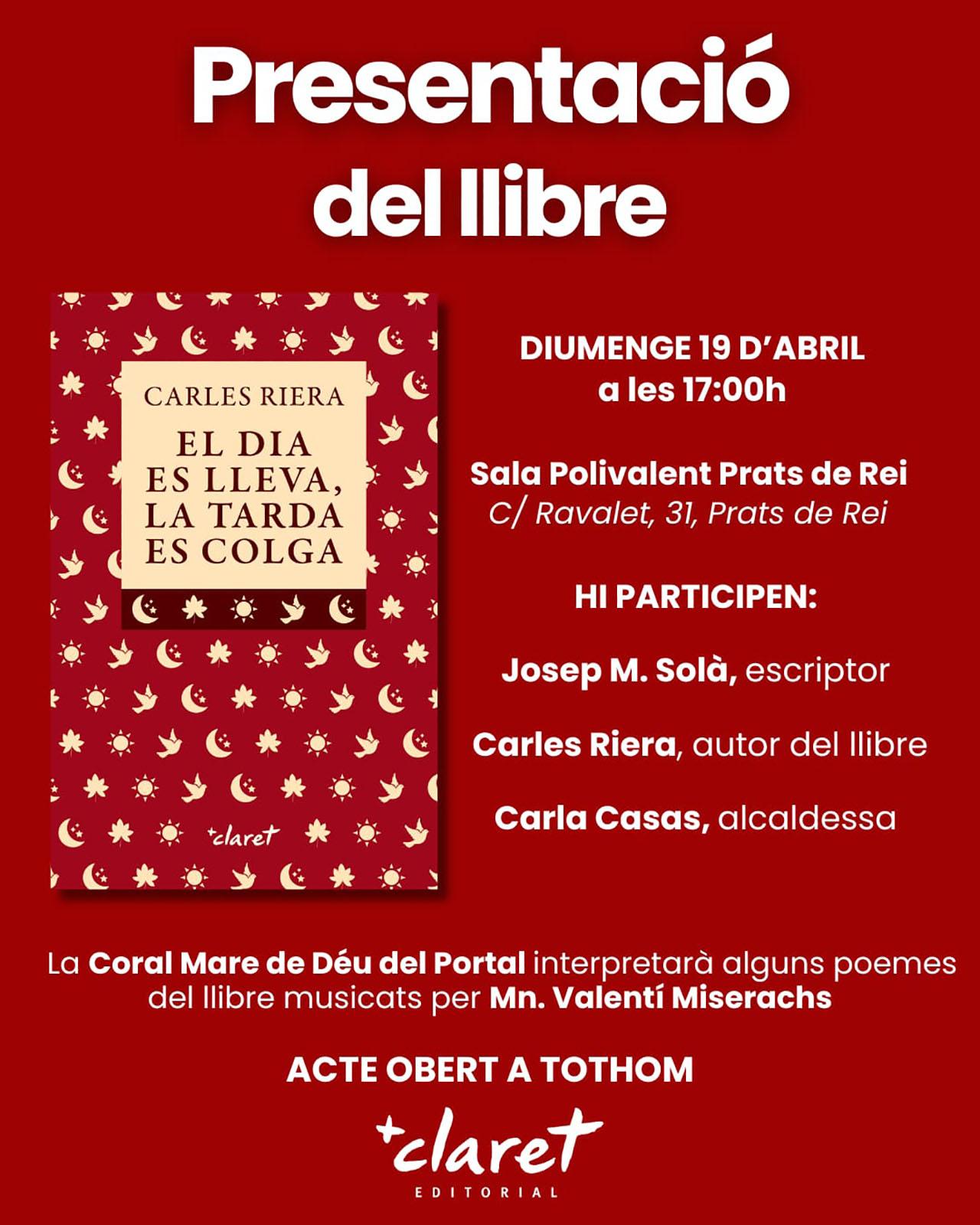 L'acte comptarà amb la presència de l'autor, Carles Riera i Fonts, l’escriptor Josep M. Solà i l’alcaldessa Carla Casas. La Coral Mare de Déu del Portal interpretarà poemes del llibre musicats per Mn. Valentí Miserachs.