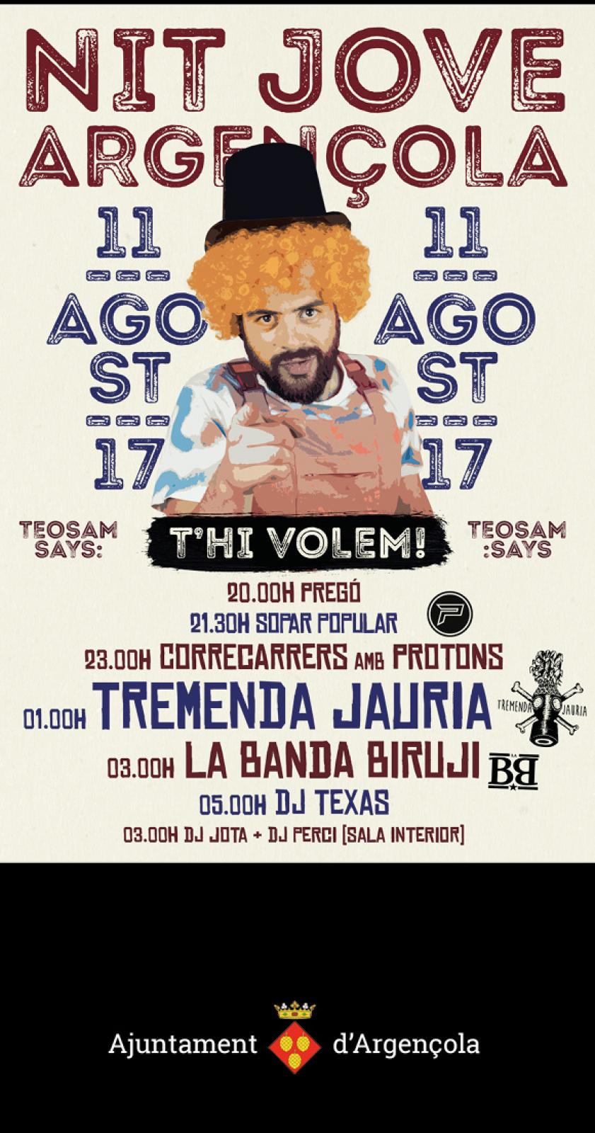 La Nit Jove començarà a partir de les 11 de la nit amb el clàssic corre carrers, amenitzat amb la música dels Protons. A partir de la 1 de la matinada podrem escoltar a la Plaça Mariano Mestre els concerts de Tremenda Jauria i La Banda Biruji, a partir de les 3 de la matinada. La nit acabarà amb la disco mòbil de DJ Jota, DJ Perci i DJ Texas.
